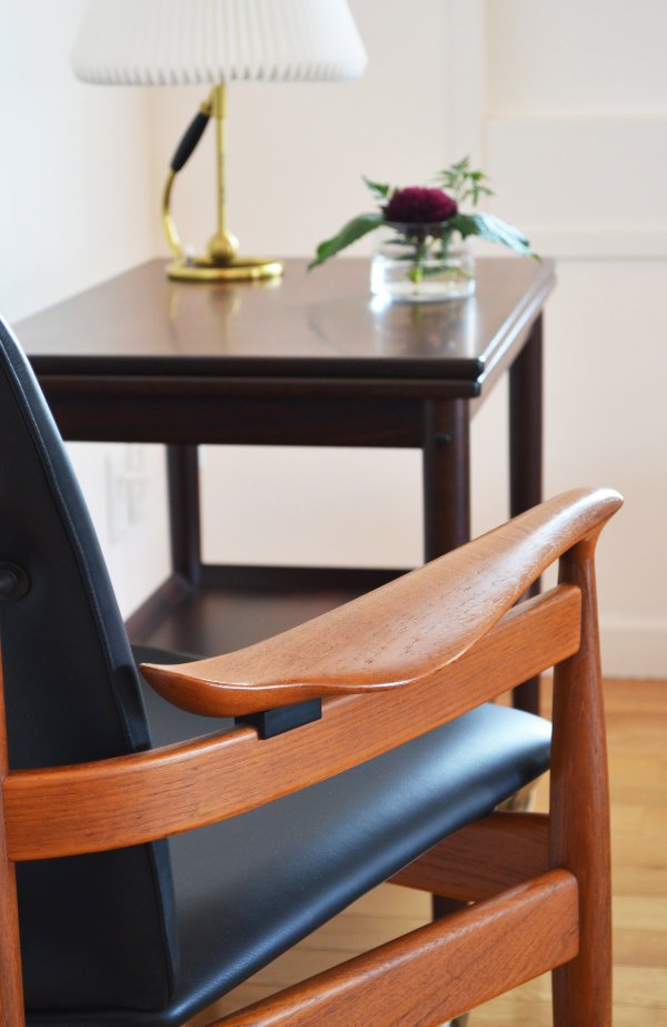 デザイン年は1963年頃です。脚や貫のフレーム部分から、座面や肘を宙に浮かせたようなデザインで、フィン・ユール独特の個性が表現されています。